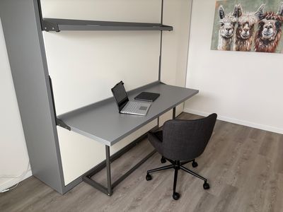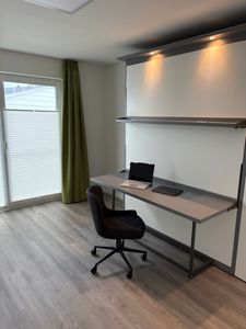 Schlafzimmer 2: Flexibel nutzbar: Ein Schrankbett (160 × 200 cm), das tagsüber in einen hochwertigen Schreibtisch umgebaut werden kann – ideal zum Arbeiten oder als Spielzone für Kinder.