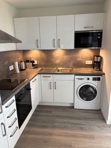 Die moderne, offene Küche mit Induktions-Herd, großem Kühlschrank, leiser Geschirrspülmaschine, Espresso- und Kaffeemaschine sowie Mikrowelle und kompletter Küchenutensilien-Ausstattung macht das Kochen zum Erlebnis. Ein ausziehbarer Esstisch bietet Platz für gemeinsame Mahlzeiten – perfekt für Genussurlaub oder kulinarische Abende.