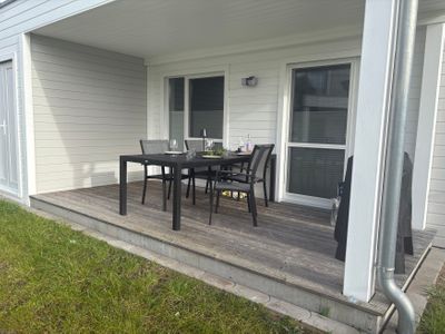 Die eigenen zwei Terrassen mit bequemen Gartenmöbeln und Loungebereich, einer Rasenfläche und einem großen Weber Lunim Elektrogrill lädt zum Verweilen ein – ob für Grillabende, Gemüse garen oder Fisch räuchern oder einfach nur die Sonne genießen.