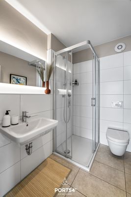 Auch in den Badezimmern setzt sich der hochwertige Stil fort. Das Hauptbad ist modern ausgestattet mit Dusche, Whirlwanne, Kosmetikspiegel und Haartrockner – ideal für entspannte Wellnessmomente nach einem Tag am Meer. Ein zweites Duschbad im ersten Obergeschoss rundet den Komfort ab. Ein besonderes Highlight ist die Infrarotkabine, die Dir nach einem Tag an der Ostsee wohltuende Entspannung bietet. Die Fußbodenheizung sorgt das ganze Jahr über für angenehmes Raumklima.