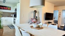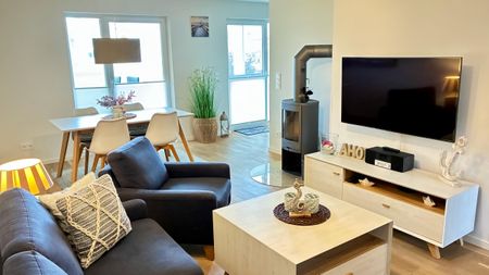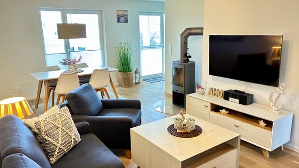 In dieser modernen und gemütlich eingerichteten Wohnung fühlen Sie sich schnell wie Zuhause. Der "Heimathafen Schlei" bietet mit 2 Schlafzimmern und einem großen offenen Wohn-/Essbereich reichlich Platz für bis zu 4 Personen. Die exzellente Lage wie der fußläufig erreichbare Strand bringt sofort Entspannung pur, sodass der Alltag schnell in Vergessenheit gerät. Der große Wohn- und Essbereich ist modern eingerichtet und durch bodentiefe Fenster sehr hell. In der kalten Jahreszeit können Sie es sich dank der Fußbodenheizung in allen Räumen sowie vor dem Kamin im Wohnzimmer gemütlich machen. Die offene und hochwertige Küche lädt zu gemütlichen Kochabenden ein. Ein Schlafzimmer verfügt über ein Doppelbett (180x200cm), das zweite Schlafzimmer über 2 Einzelbetten (je 90x200cm). Beide Schlafzimmer verfügen über einen Flatscreen-TV und Verdunkelungsmöglichkeiten. Ihre Wertgegenstände können Sie sicher in dem dafür vorgesehenen Safe verwahren. Nach einem Spaziergang an der frischen Ostseeluft können Sie sich in der Infrarot-Sauna und in der Whirlwanne erholen. Abends können Sie den Tag wunderbar mit einem Glas Wein auf der Terrasse ausklingen lassen und die Sonne am Horizont untergehen sehen. Die Natur rundherum lädt zum Wandern und Radfahren ein, im Sommer blühen die Rapsfelder wunderschön und auch die Kinder kommen nicht zu kurz. Direkt am Haus gibt es 2 Parkplätze, eine Lademöglichkeit für E-Bikes und einen Fahrradschuppen.