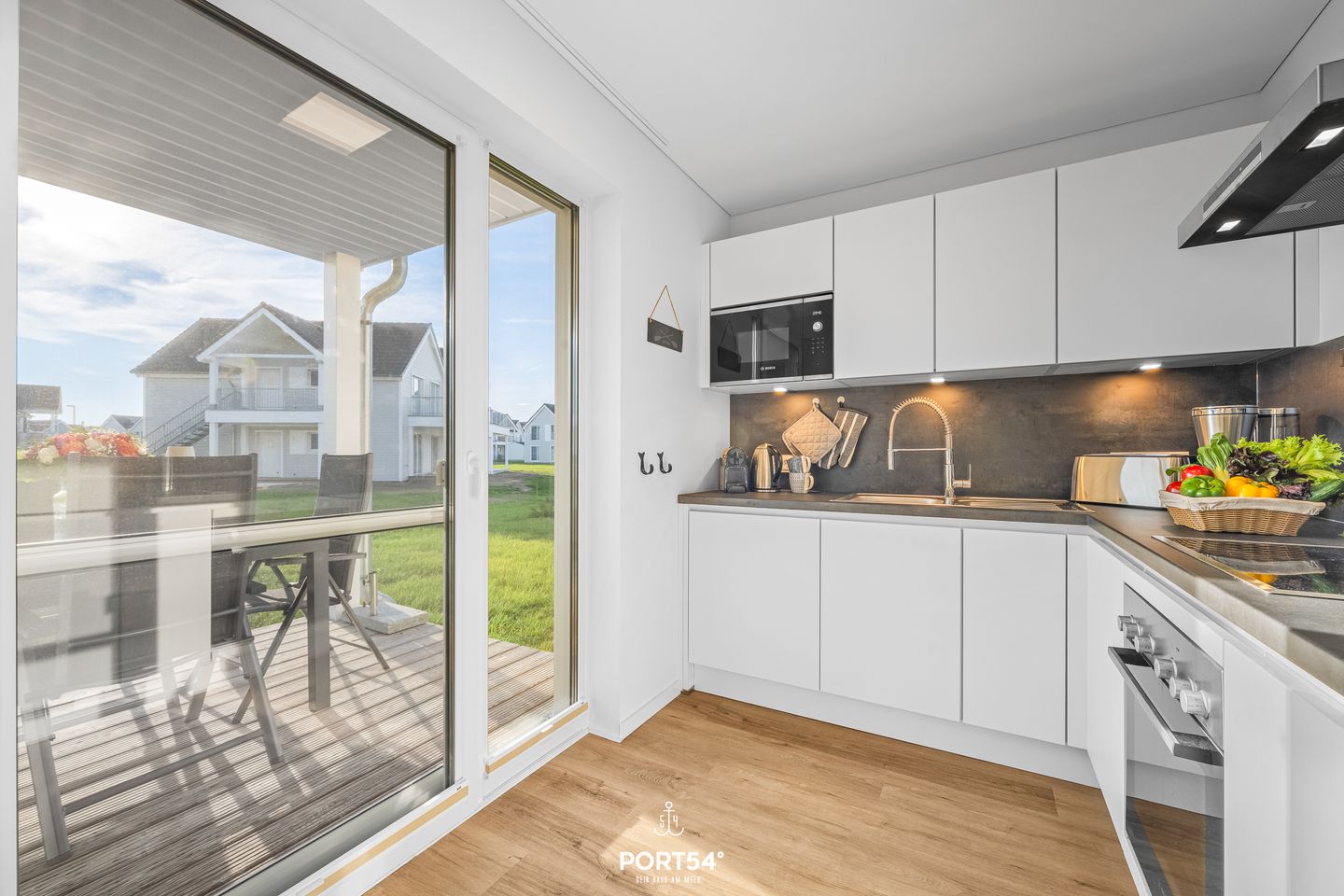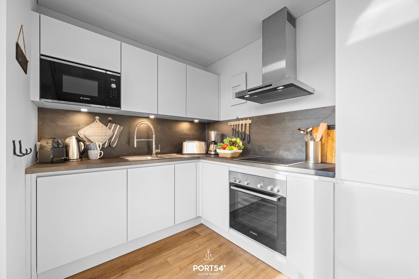 Die offene Küche ist nicht nur funktional, sondern auch ein Ort zum gemeinsamen Kochen und Genießen. Ausgestattet mit modernen Geräten – darunter Backofen, Geschirrspüler und Nespresso-Maschine – bietet sie alles, was Sie für kulinarische Ausflüge von Snacks bis hin zu festlichen Menüs benötigen.