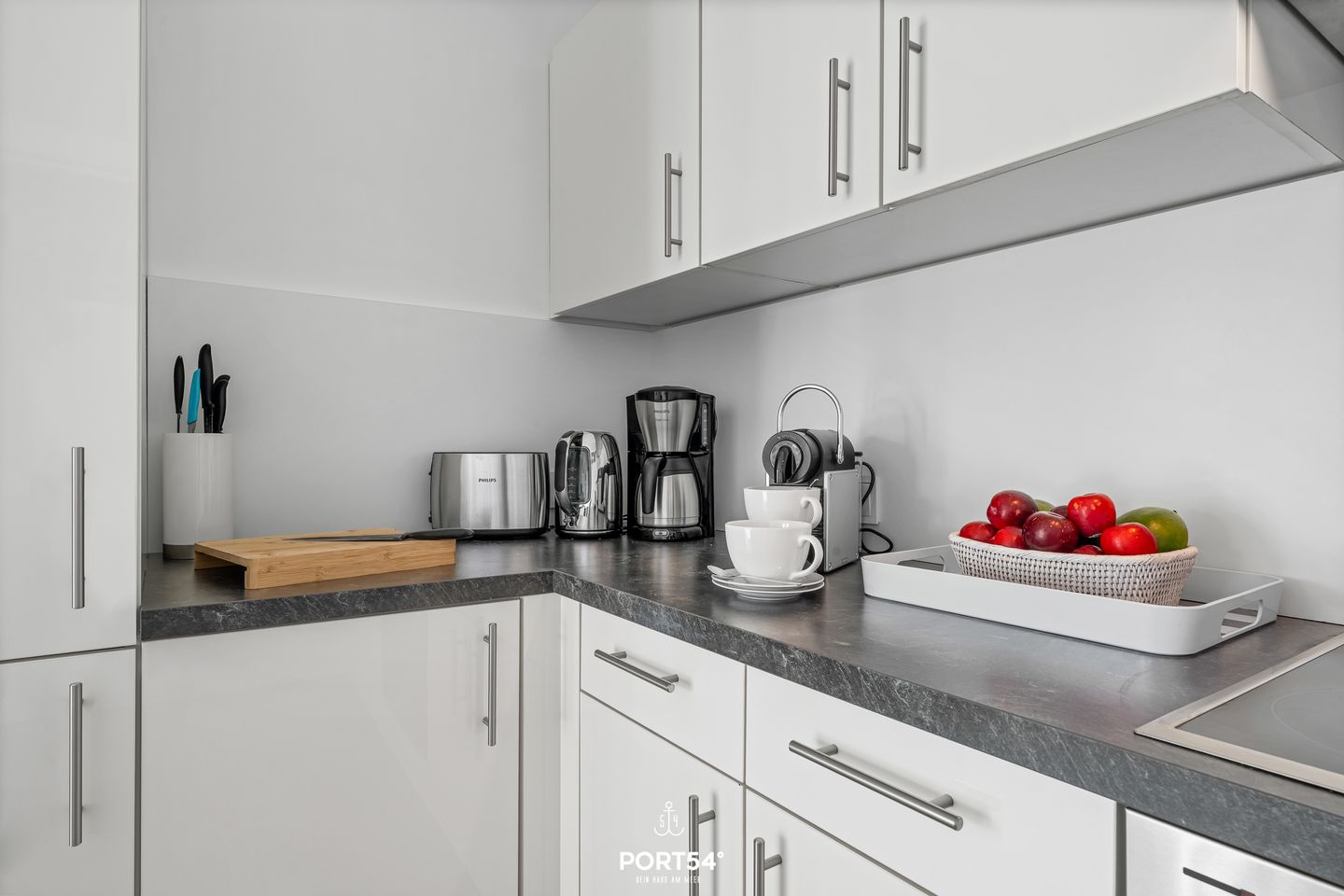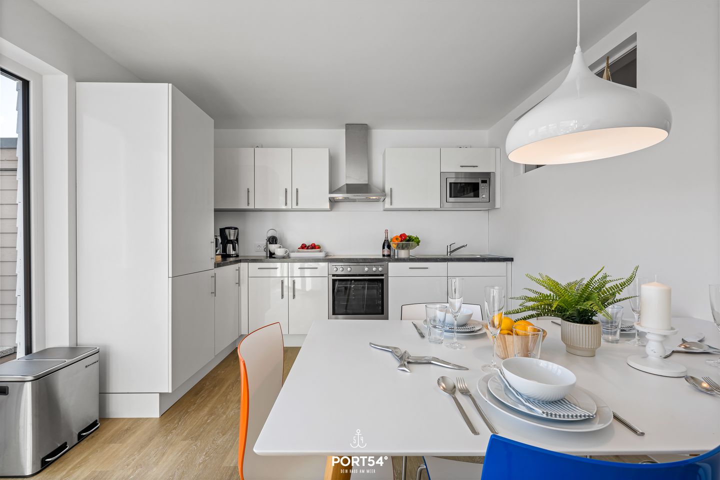 Das offen gestaltete Wohn- und Esszimmer begeistert mit einer großzügigen Raumaufteilung, einem gemütlichen Sofa, einem Esstisch sowie moderner Unterhaltungselektronik wie einem digitalen TV und DVD-Player sowie Gesellschaftsspielen für abwechslungsreiche Abende. Die an den Wohnbereich angrenzende, offene Küche ist vollständig eingerichtet: Ceranherd, Backofen, Kühlschrank mit Gefrierfach, Spülmaschine, Kaffeemaschine, Nespresso-Espressomaschine, Toaster, Wasserkocher sowie sämtliche Küchenutensilien lassen keine Wünsche offen.